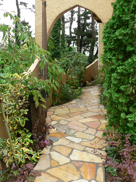 オープン外構のガレージ周りとアプローチを植栽で特徴を出した庭。 メンテナンスをできるだけしないように、カラーリーフと呼ばれる 葉の色に特徴がある植物を選び、アレンジしています。 低い壁の上にはアイアンのブームを置いて、小さな植えマスから伸びたブラックベリーが絡みやすいように誘引しています。 植栽スペースは少なくても、ツル性のもの、個性的な植栽でガーデニングが楽しめるように考えました。